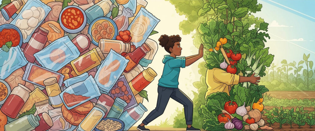 - Cibo Processato e Alimenti Riassemblati Trasparenza e Impatto Ambientale. Si evitano piatti pronti, salse in busta o surgelati pre-cotti per la mancanza di trasparenza su ingredienti e processi industriali, oltre che per l’eccessivo packaging monouso. La cucina casalinga diventa un atto di resistenza